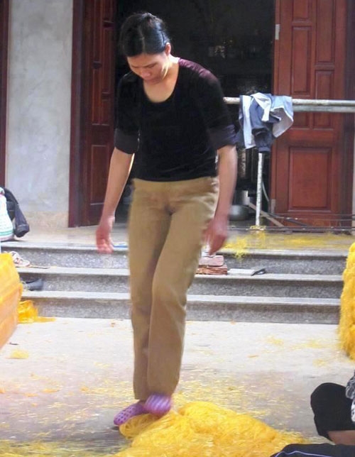 Đầu tiên, bì lợn (còn lẫn mỡ) sẽ được xịt nước thẳng vào để rửa. Mỡ lợn được các nhân công vừa “dẫm, đạp” vừa xịt nước để rửa, tuy nhiên vẫn bốc mùi, kèm theo sạn đá dính đầy.